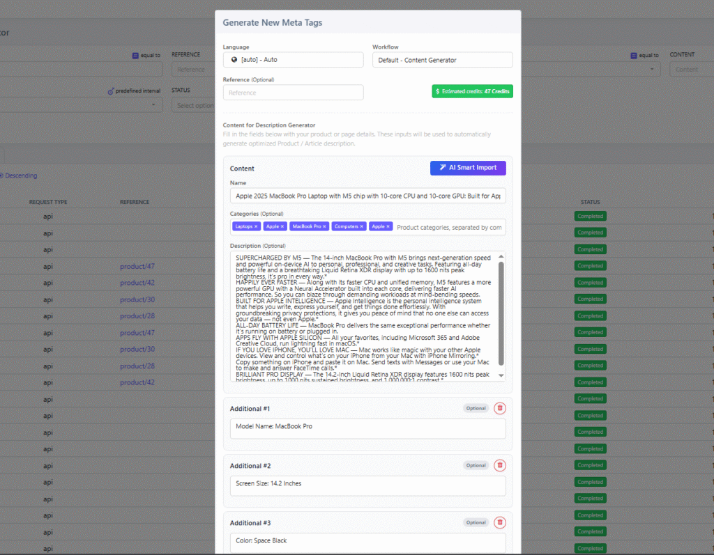 After a short loading period, you will have all the necessary information extracted, and you can generate a new description optimized for conversions and SEO: